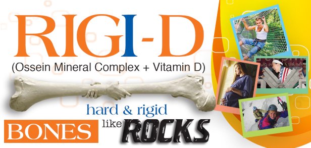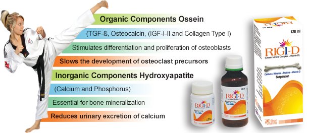 The organic matrix & mineral component of bone tissue are provided in RIGI-D in physiological proportional. Vitamin D3 promotes re-absorption of Calcium in the kidneys & enable normal mineralization of bone. It is also necessary for bone growth & bone remodeling by Osteoblast & osteoclast.